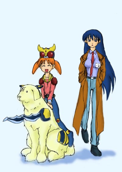 ちよちゃんがクウガで、榊さんが一条さん。で、忠吉さんがビートゴウラム。ちよちゃんが忠吉さんに乗って散歩しているのを見て、ピンと来てしまいました。一発ネタです。 鉛筆書きにブラシで直接彩色しています。ええ、もちろん時間のせいです。締切日に時計と睨めっこしながら描き始めました(笑)。サークル代表に「今回裏表紙無し」って電話したら却下されました。ま、当然ですね(爆)。ネタは用意していたのですが・・・。