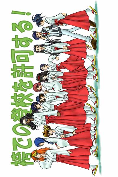 初めての人は、はじめまして。本誌イラスト担当のしらず詠人です。いつもの調子の表紙&裏表紙、今回のお題は、「ガンパレ」で「朝霧の巫女」でございます。朝霧の巫女、ご存知でしょうか?私、しらず詠人一押しの、近年まれに見るフェチ漫画でございます。・・・一押しの漫画、というよりむしろ、このフェチ度が一押し、です(笑)。作者の「巫女」にかける情熱に心打たれ、この感動を広く世に知らしめるべくネタの吟味に取り掛かったところ、そー言えば、ガンパレって壬生屋さんの格好を芝村一族の権力で合法にしたんだっけ、それならこういう事だって・・・で、こうなりました。わかりにくいですか?巫女さんと言えば火野のレイちゃんですか!?サクラさんのほうがいいですか!!?・・・そうですね、そうす