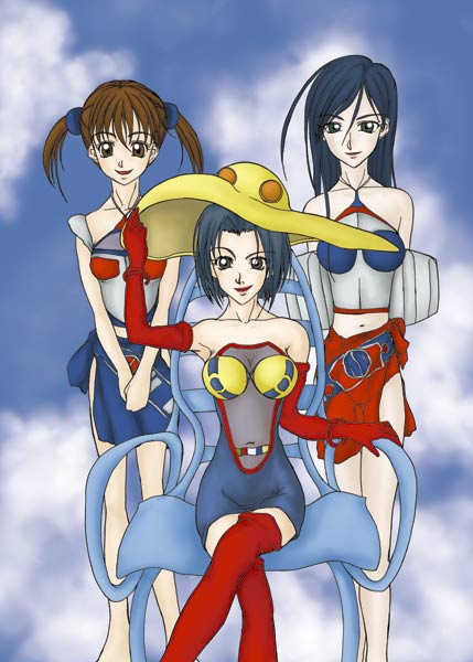 蓉子様は当初の予定通りのお姿になられたのですが、如何せん後ろの二人の格好は、当初何も考えていませんでした(笑)。まんまなのは前号でやってあるので、トロピカル仕様と言うことで今回水着に。突発的に思いついた割にはいい感じにまとめれたのではないかなぁと。これで、何でもっと勢いのある絵にならないのかなあ・・・やっぱ、萌え分か(汗)。