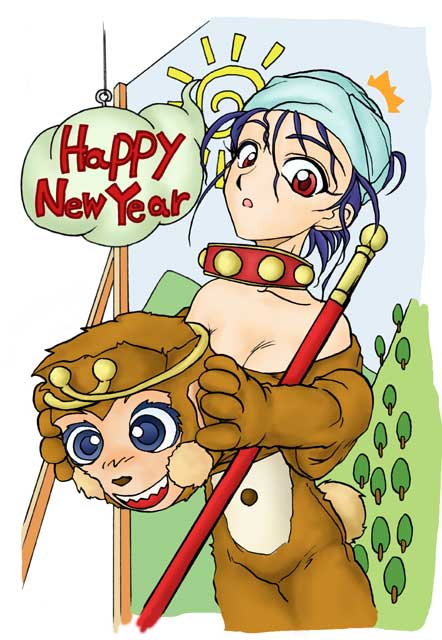 2004年の年賀状イラストです。1月1日に、三十三間堂を全力で走るが如くの勢いで完成させてポストに投函しました。神が見えました(笑)。おかげで、出来は今一今二。やっぱ、神なんて居ません(爆)。 元々は、はがき用のイラストです。コレ受け取ってどうよ?と思う事も有るのですが、どうせ返ってこない連中に出しているので、相手を思いやる必要は無し(笑)。いや、一応繕ってはいるのですよ。首や肩口が剥き出しだと、露出度が高すぎるかと思って、隠してみたり。隠すアイテムに”首輪”を選択するあたりは、どうかと思うのですが(笑)。 それでは、 明けまして おめでとうございます。 今年もよろしくお願いします。 よね参/しらず詠人 |