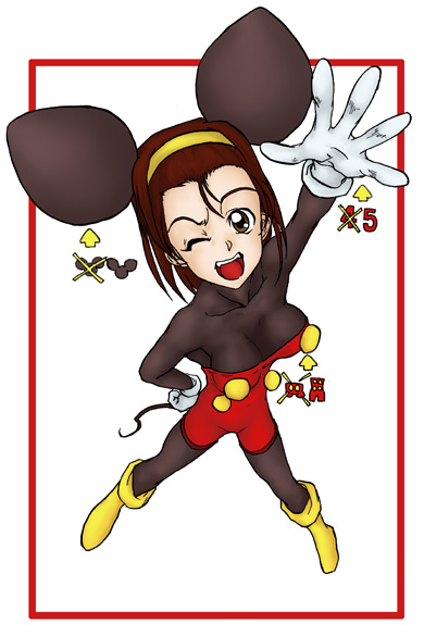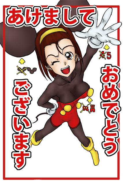 恒例の、年一回更新のWeb用カラーイラストです・・・orz。なんとかせねば。 ネタは、見ての通り(爆)。 詳しく説明すると、世界で最も有名なネズミのキャラクター”トッポジージョ”にインスパイアされつつもパクリにならないようにカラーリングを黒に変更。ついでに耳もちょっと変える事で「全くの別物」に仕上げています。 ネズミのコスチュームの女の子ですので、水木しげる氏のラインで「妖怪ネズミ女〜」的なのが今時のストレートネタ(?)ですが、「怪人ネズミ女〜」変換して仮面ライダー→石ノ森正太郎ライン変換で009に。念の為、マフラーと袖とかを取ッぱらって軽装にし、コレマタ別物に。 ここまでやれば、MIBも納得してくれる事でしょう(笑)。 某映画会社製の劇場映画は、トロン・ジャングル大帝(オリジナル版)・ノートルダムの鐘の3本しか見ていません。ネズミなんて出てこなかったので見たこと有りません♪ あ、ついでに人間の女の子なので、普通に5本指です(笑)。ほら、別物。 それでは皆様、今年もよろしくお願いします。 |