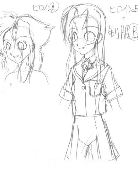 | 知人の企画した同人誌本「いまどきの美少女ゲームの作り方(仮)」用に依頼された原稿です。まっとうな、「表キャラ」については、別の”先生”が担当し、私は「裏キャラ」、今までに無い・見た事無い・あったらやだなあ(笑)といったコンセプトで描いてます。ちなみに、諸般の事情と言うやつで、この本まだ出てません。原稿料はもう食ってしまいましたので(笑)、原稿自体はお蔵入りしてもかまわなかったんですが、折角なので今回許可もらって載っけました。・・・他に載せる物無いし(爆)。 |