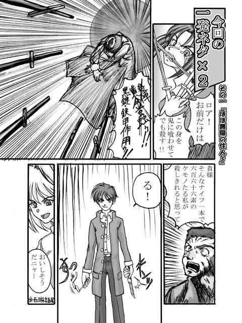 | 「モノのキレやすい線が見えるんです1〜5」は、月姫のみをネタとしたオリジナルの漫画です。…オリジナル、とは言わないか(笑)。コマ割り、ネタ繰り等は私本来の芸風でやってます。 ゲーム中の枝葉末節の事柄をとらまえて、軽くツッ込みを入れたりボケてみたりと言う、得意のお手軽1Pショートショート漫画です。 「今回の一発ネタ×2」は、いつものネタ元複合技。一発目「ほぼ無限の住人S」は、シエル先輩の黒鍵の持ち方が、黄金蟲の発射体制に見えて仕方が無いので、つい(笑)。その後は、1Pにまとめる為の蛇足です。 二発目「秋葉がんばる!」は、最強のお嬢様ならコレだろうと(笑)。ちなみに、元ネタは つづく |