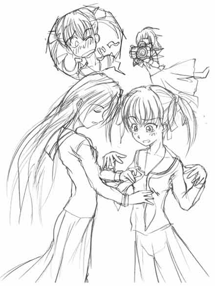 セーラーカラーとタイの構造についての、らくがき。 襟の下にタイを回してあるのではなくて、襟(セーラーカラー)自体がタイになっているんですね。 本文中にも記述はありますし、挿絵もそれっぽくなっていたのですが、今一実感が湧かなかったので、人に聞いて確認しました(笑)。ありがとう☆ こんなシーンは劇中にはありません。祥子さま!ほどいてどうするんですかっ(笑)!? |