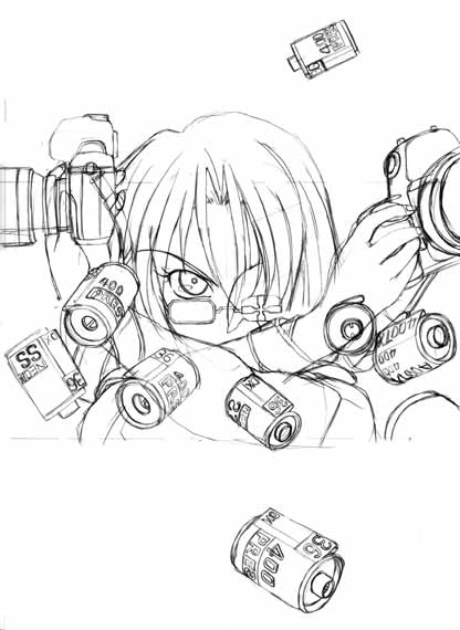 裏表紙下描きです。本当は、ソフトのパッケージ裏のイラスト、十字架を背負った後姿で行こうと思っていたのですが、コッチに変えました。薬莢=フィルムの方がわかりやすくて良いかと思って。プレストやSSをいっぱい描けたし(笑)。トライXも使いましたし、それほど違いにこだわってはいなかったのですが、なんとなくフジを使う事が多かったように思います・・・絵の事じゃねーし(笑)。 フィルム一個カット&ペーストして、左前髪の上に持ってくる予定ナリ。いや、なんとなく。 |