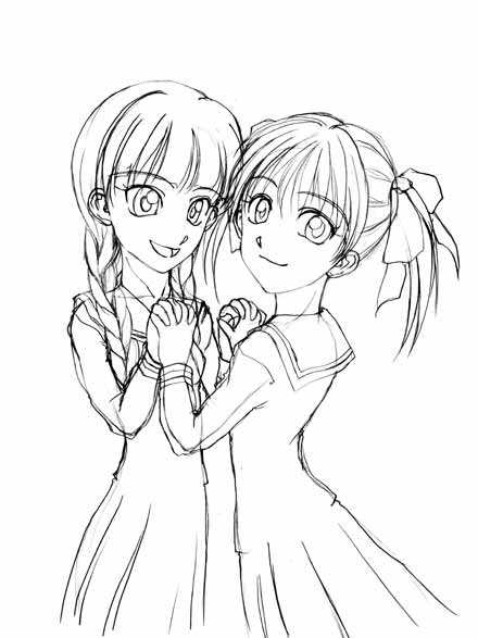 いえ、元々は「ブゥトン〜」の絵が脳に浮かんで、そのまま描こうとしていたのですが・・・背景が寂しいのでお姉さま方も描きました。データをアップしたのは別の日ですが、描いたのは同じ日。カラーを仕上げるまでの時間稼ぎの術(笑)。