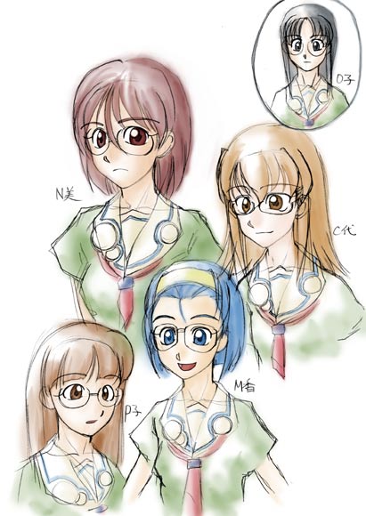何となく、らくがき。元ネタありなので、そのイメージで何体かツラツラと。性格&特長とか元ネタを湾曲して持ってこれるので、描き分け楽♪まあ、意味もなくシバリも入るわけですが(笑)。生徒会とかにすると面白そうなので決定。ちなみに、主役は副会長のN美で。 落描きに、色を付ける初の試みです(笑)。いや、モノクロをWeb上にアップしている方が少数派だったワケですが。 この塗りだと、5キャラ描いても早いです。彩色一時間くらい。一人当たり10分少々の計算です。 淡い色味って、水彩ぽくて好き。”カラーイラスト”と言われると、きっちり塗りたくなるわけなのですが、落描きなので気負わずラフに。 しばらく、こんな調子で行ってみましょうか? |