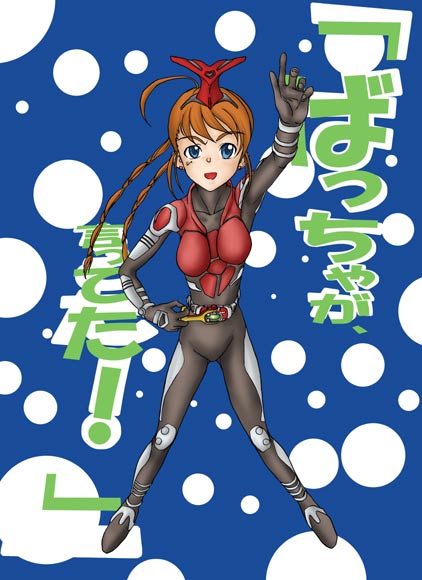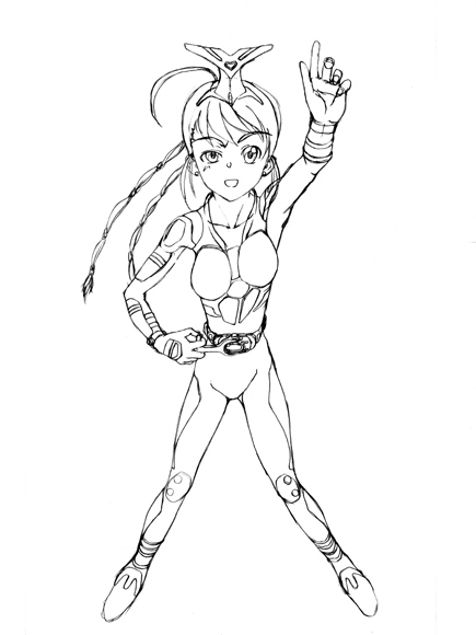 薄目=半眼で例のポーズの天道っぽさを出したかったのですが、アリカは目をはっきり見開いた元気な表情がトレードマーク。両立出来無いかと思って、上のように片目を半眼にしてみたのですが・・・どっちつかずで今一(汗)。よって、ペン入れ前に右目を描き直してあります・・・。