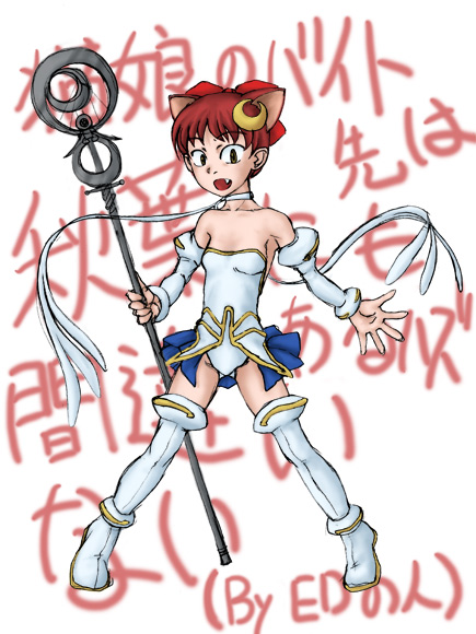 というわけで、前ページのペアイラストです(笑)。 きっと、猫娘はこんなバイトもしているに違いない。 ・・・秋葉とかで。 猫娘の萌えキャラ化に敬意を評して、アルクでも一番萌えに特化していると思われるファンタズムーンの格好をしてもらいました。 描いておいて何ですが、意外と萌え化が進んでません・・・いつもの格好の方が萌え度が高い(笑)。 というか、前ページの猫娘のコスをしたアルクの方が、萌え度の増加が見られるのは何故(爆)!? ・・・あの猫娘のいつもの格好に萌えの秘密があるのか?奥が深い(爆)。 |