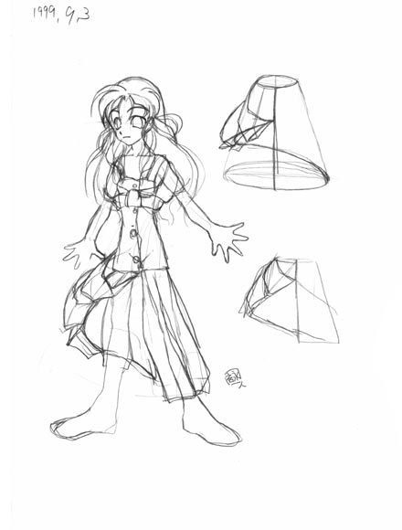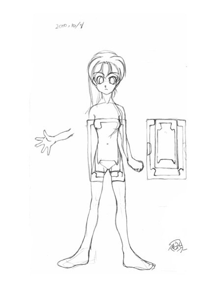 | シャフォンの中期くらいのデザイン。髪を下ろしてるのと、コスチューム、得にスカートの形状が決定稿と違う。 このスカート、フィンファンネルのように、板状に一枚一枚分離していろいろ使えるアイテムだったはず。 |