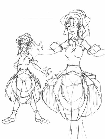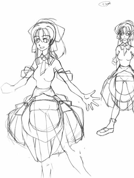 アリスのほぼ決定稿。上着はシャツの襟と袖があって、その下はTシャツ状。エプロンを首でかけると普通のシャツに見える。で、エプロンはスカート釣りとして使用中。