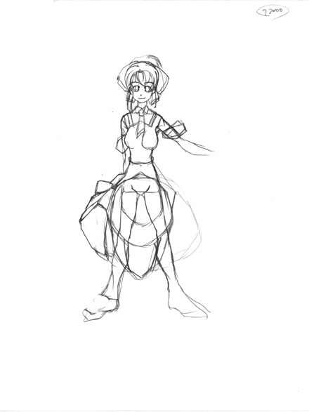 アリスのほぼ決定稿。前ページの、らくがき12とほぼ同じ。わかりにくい所が違うんですが、まああまり意味はありません(笑)。 テレスは、エプロンを首にかけ上半身は襟&ネクタイのシャツを着ている感じです。スカートは、反対に三段折りで短くしてます。同じ服のパーツ組みで、上下のバランスがアリスと逆。ちゃんと絵で描きましょう、私(笑)。