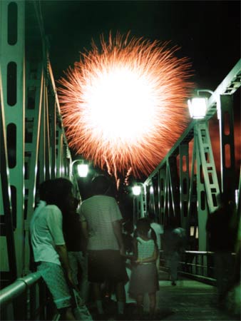 花火の写真は苦手です。場所取りで全てが決まって、それには経験と偶然と長時間の場所確保にまつわる、なんだかわからないしがらみ処理能力が必要になってきて、桜の花見より競争率が高いです。 そんなの嫌なので、離れた場所や穴場を探してふらついたりしてみますが、やっぱり「激戦区」でしか普通の花火写真は撮れません。 ちょっと、得意の近景を入れて花火をごまかしてみましたが、いかがなものでしょう?