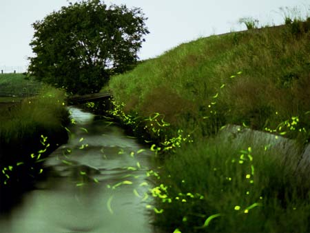 空が明るく、夕方に撮ったみたいな写真ですが、これ実は街の明かりが完全に消える真夜中まで待って撮ってます。8時9時だと、街明りで空が明るくて綺麗に撮れません。何回か通ってデータを集めました。 別構図、別の場所の写真もありますが、この樹のこちら側が一番蛍が舞っていました。密かに「蛍のなる樹」と呼んでいます(笑)。