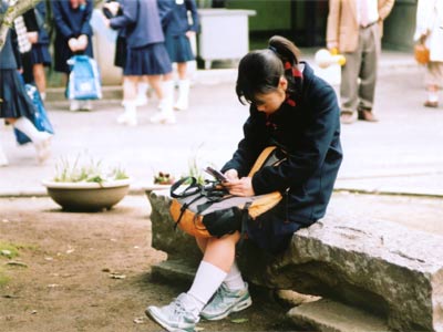 一人で発表を見に来ていた娘。確認してはいませんが、この娘も合格者です。あの笑顔は。 友達と見に来てはしゃぐ生徒が多い中、一人発表を確認するとすぐに掲示板の前を立ち去り、木陰で静かにメールを打ち始めました。 素敵です。