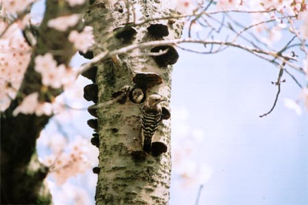 桜の木に、キツツキの一種「コゲラ」が巣を作っていました。まだ卵は孵っていないらしく、1時間くらいおきに交代で暖めている様子です。 桜が満開で、丁度見ごろ。一粒で二度おいしい写真と相成りました☆