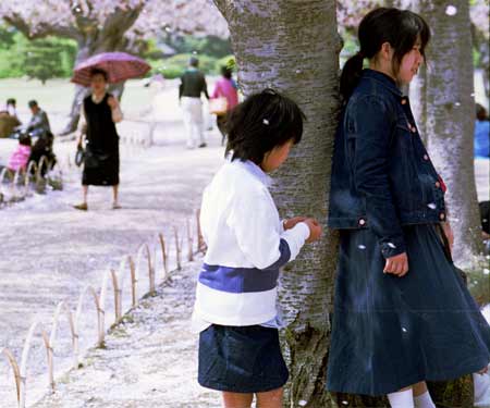 花びらの舞うのがいい感じ。 セオリーとは空間の取り方が逆。ま、かならずセオリーに従わなければならない決まりもありませんし。いい雰囲気が出ています。 レンズが望遠ズームでこれ以上引けなかったのと、右側に宴会中の一団がいたので、この構図以外では撮れませんでした。